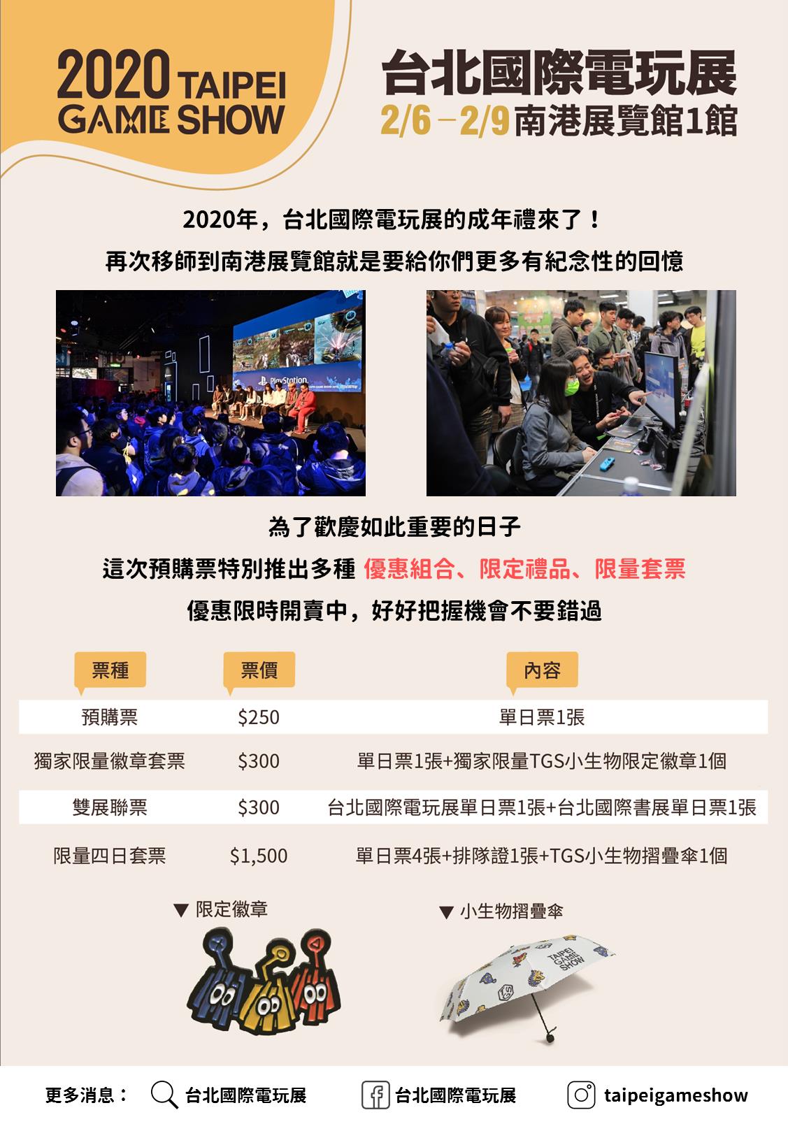 2020 台北電玩展預購票 12 月 18 日於全家、7-11、萊爾富、博客來、KKTIX 五大通路全面開賣,除了可選購優惠價 250 元單日票,主辦單位也首次在限定通路販售「獨家限量徽章套票」(全家 2,000 組售完為止)、「限量四日套票」(KKTIX 800 組售完為止)、「電玩展 × 書展聯票」(7-11),預購票販售至 2020 年 2 月 5 日 24:00,詳細內容可至官網查詢 https://tgs.tca.org.tw/。